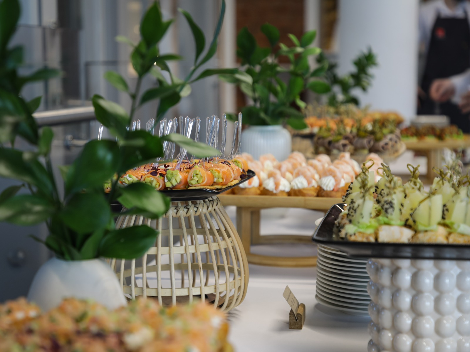 Чтобы накрыть фуршет на свадьбу или кофе-брейк на конференцию, наши сотрудники используют большой ассортимент раскладочных блюд и подставок для них, в зависимости от выбранного стиля накрытия. Например, для накрытия фуршета в эко-стиле используется декор из натуральных материалов, таких как дерево, камень, живые растения.