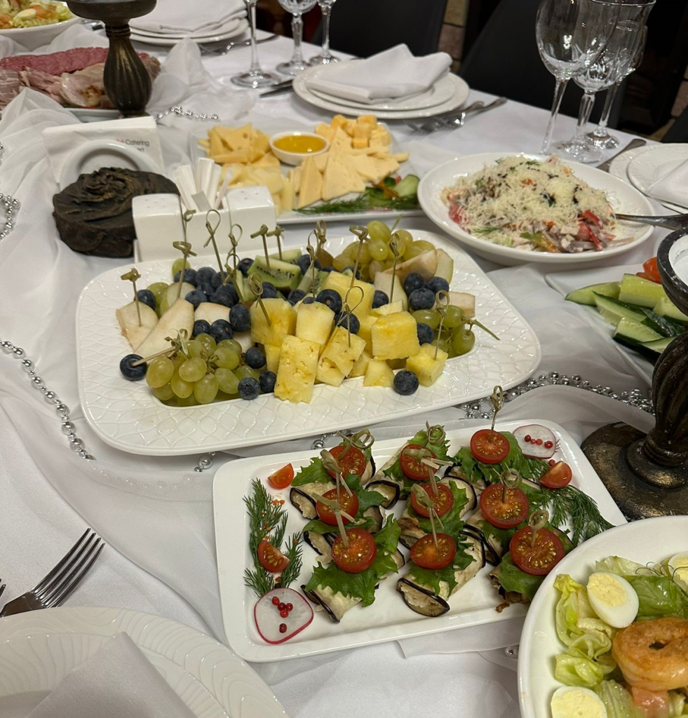 Банкет – это привычное для нас застолье, где все участники объединены за красивым и богатым столом. Конечно же, наполнение меню может отличаться в зависимости от предпочтений заказчика, но основной ассортимент всегда един: обязательно присутствует разнообразие холодных закусок и нарезок, несколько видов салатов, горячие закуски и горячие блюда. В случае, если мероприятие не продолжительное, от некоторых пунктов мы рекомендуем отказаться, так как избыток еды ничуть не лучше, чем ее нехватка.