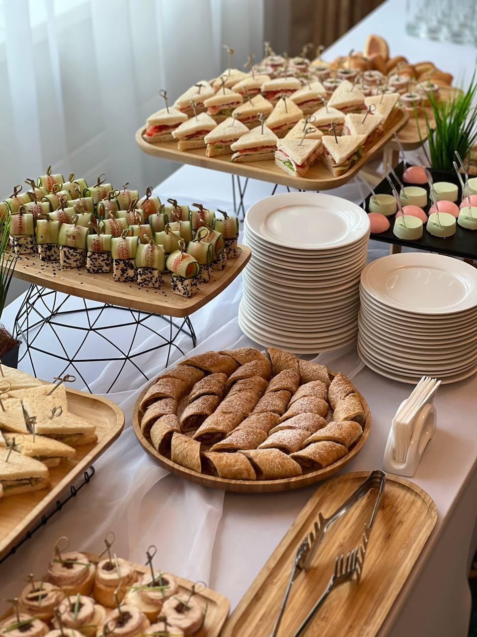 Для проведения конференции мы рекомендуем заказать кофе-брейк. Между проведениями лекций от спикеров, для участников можно подготовить короткие, но сытные перекусы, которые позволят быть собранными и бодрыми в течение всего дня. Если мероприятие продолжительное, в обеденное время стоит дополнить его сытным фуршетом или накрытием ланчей для участников встречи. Завершение встречи в конце дня может быть скрашено торжественным банкетом