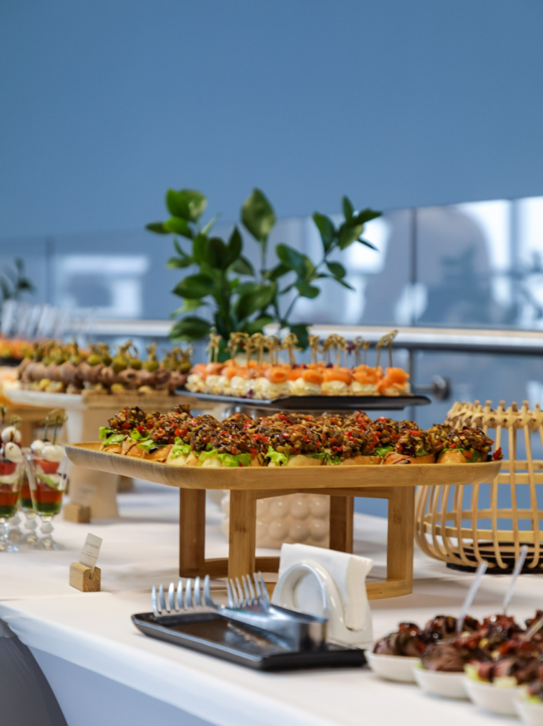 Например, если у вас запланирована презентация продукта или открытие нового шоурума, мы рекомендуем заказать фуршет. Всех гостей, которые будут прибывать на площадку, будут встречать официанты с напитком и легкими закусками, а после официальной части мероприятия будет организована фуршетная линия с более сытными и разнообразными канапе, брускеттами и другими закусками.