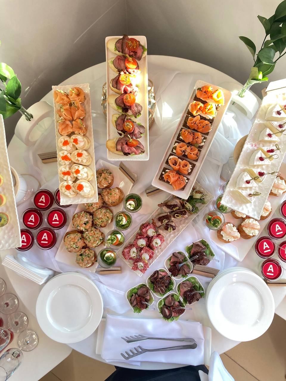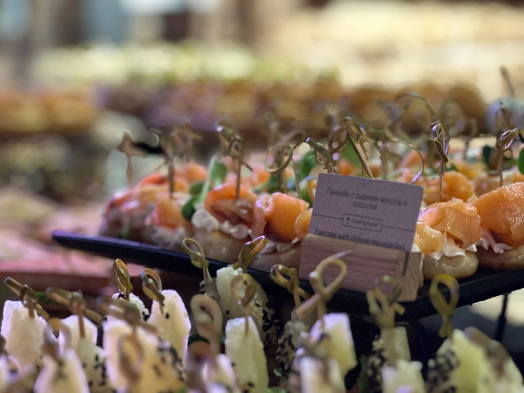 Для такого мероприятия лучше всего накрыть сытный стол с ассортиментом холодных канапе и нарезок, обязательно запланировать подачу горячей закуски (или двух!), ну и нельзя забывать о сытном горячем блюде. Общий выход на гостя не должен быть меньше 900 грамм, если только вы не уверены в том, что именно ваши гости едят меньше среднестатистического количества.